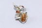 Der Anhänger der handgefertigte JRP Design Kette „Bernstein abstrakt“ wurde aus Aluminium gefertigt und mit drei kleinen Bernsteinen besetzt. Um einen guten Halt zu gewährleisten, wurden die Steinchen mit dünnen Messing-Drähten befestigt, was optisch sehr gut aussieht. Insgesamt ist die Form des Anhängers sehr außergewöhnlich, was den Charme der Kette ausmacht. Das Halskettenband, an welchem der Anhänger befestigt wird, besteht aus schwarzem Rindsleder mit einem Durchmesser von 2 mm. Zum leichten Öffnen bzw. Schließen der Kette, wurde ein silberner Karabinerhaken-Verschluss eingesetzt. Da es sich um Einzelstücke handelt, können auf Wunsch auch individuelle Änderungen vorgenommen werden.